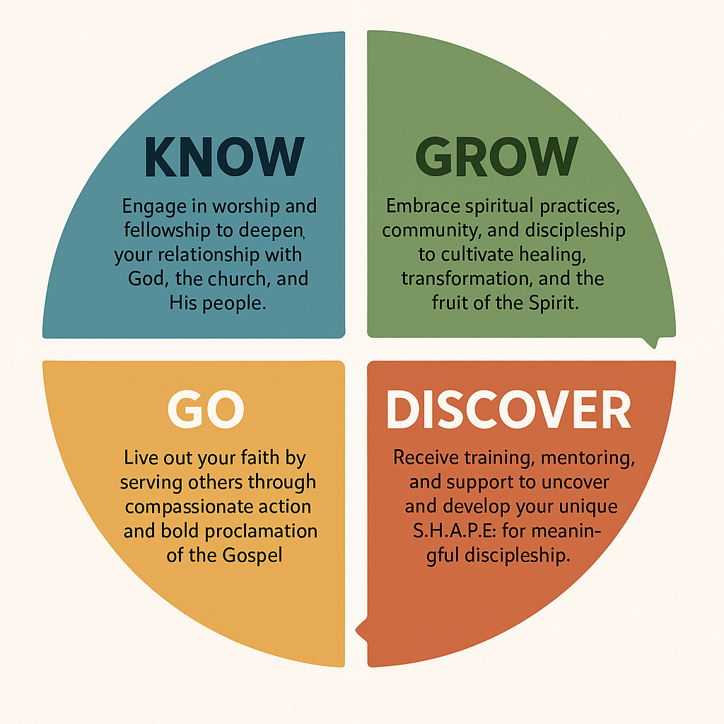 We will develop teams, events, activities, and programs that focus on helping people KNOW,GROW, DISCOVER, and GO in a relational way so that we are fulfilling our mission of Loving people where they are and helping them find Jesus.